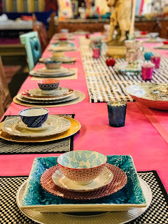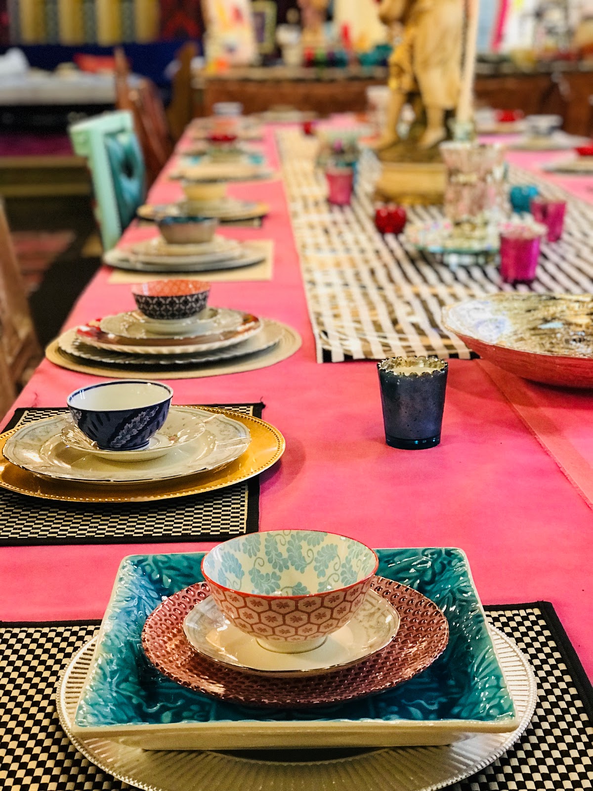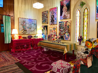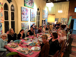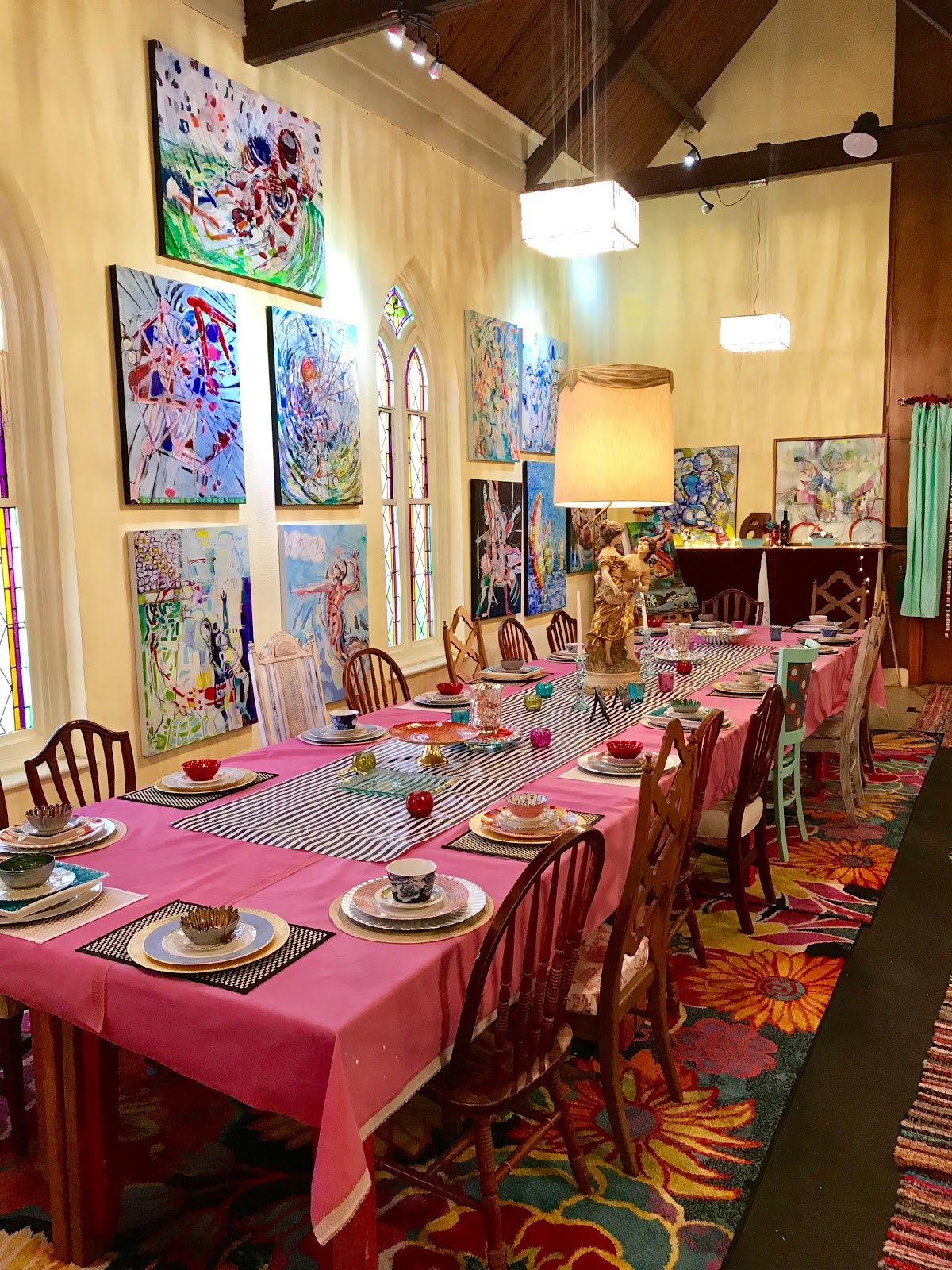 Because I am a colorist I knew my art would bring a huge amount of color. I didn't have a budget to change the floors, so I found really affordable rugs and tar paper which I could paint. I scoured yard sales for inexpensive chairs, got a lot of furniture donated from the church, and scored some huge deals on fabrics at discount "time to get rid of" prices. I also grabbed the china from a 'long' time ago that sits and never gets used, along with some discarded pieces I found through friends, and began to build my place settings for dinners. It was exciting and exhausting but I wouldn't have changed a thing.